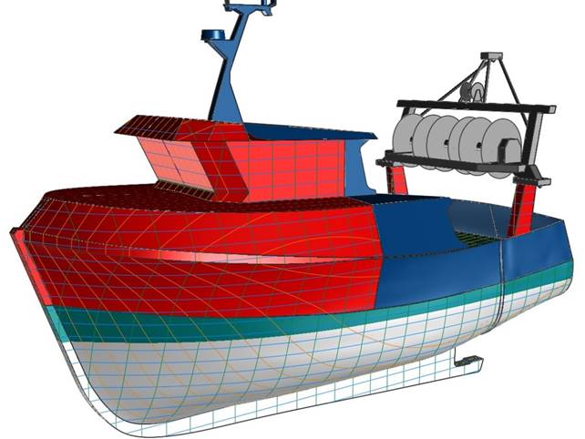Transformation du chalutier "Sandra Kevin Dylan" (11,99m) : Transformations de la passerelle et création d’un gaillard, relevé des formes, dessin des nouvelles formes pour adapter le navire aux métiers pratiqués, plans de structure des modifications, stabilité